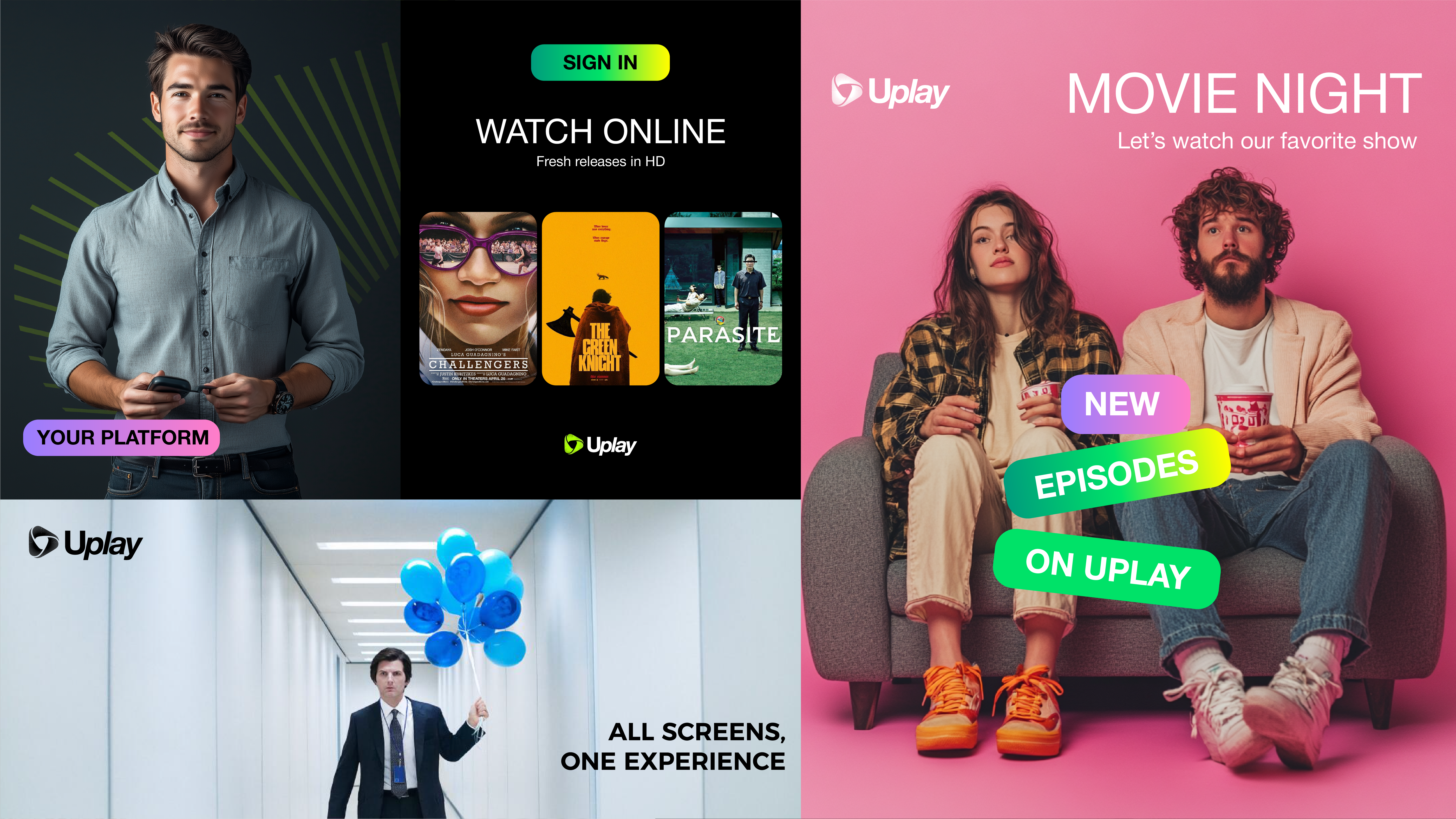 We treated Uplay as a living cinematic space, where every screen becomes a gateway and content moves without interruption. The identity is built around the Möbius strip – a loop with no beginning or end, symbolizing continuous flow and endless choice. Circling from one side to the other, the form mirrors Uplay’s promise of fast, uninterrupted access across devices, turning everyday viewing into a smooth, immersive journey.